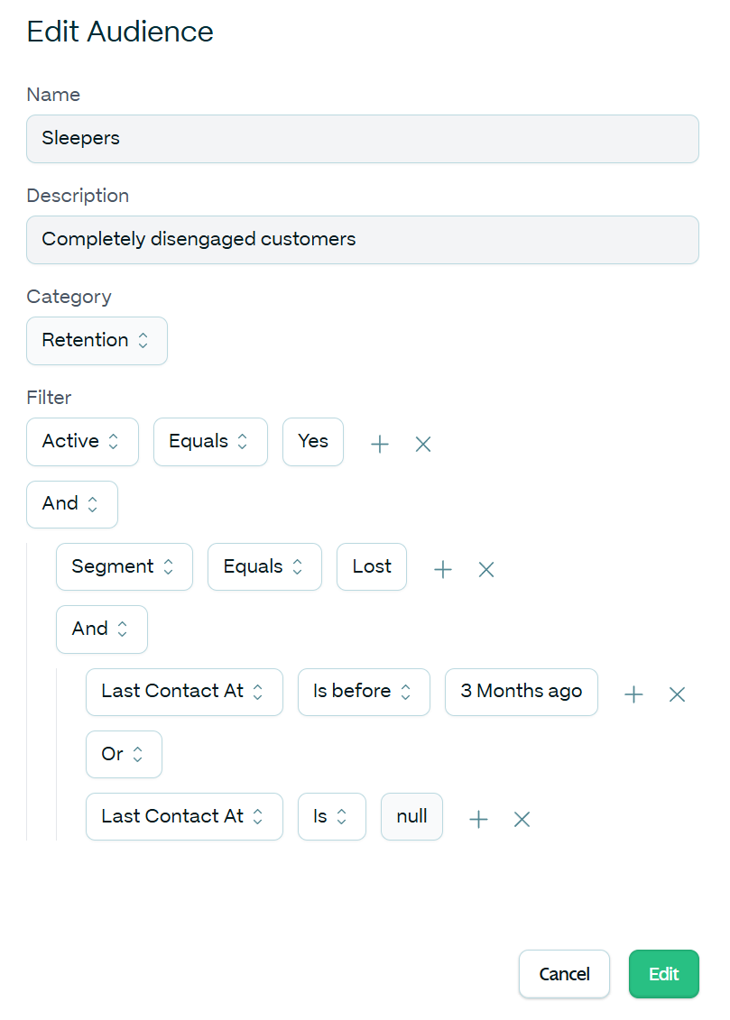 Instead of building audiences from scratch every time, you start with intelligent defaults—designed around real retention goals. From there, you can tweak, extend, or create your own from scratch.