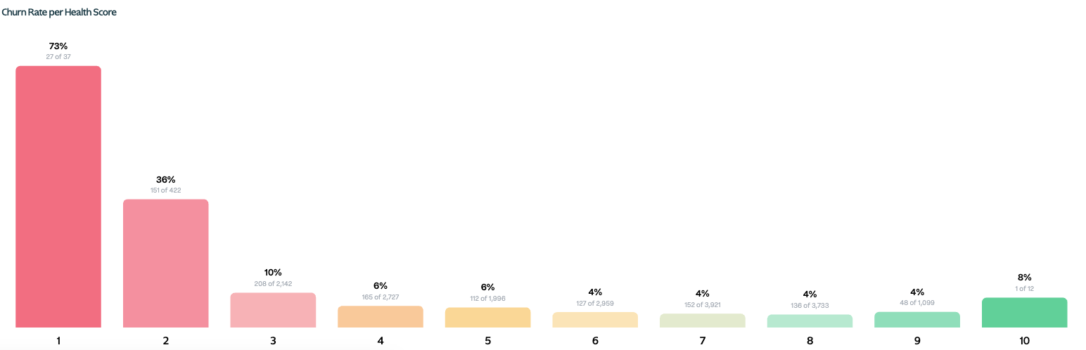 The churn rate per health score is visualized using a bar graph that highlights the percentage of customers who have churned, segmented according to the health scores they were assigned. Each bar represents the proportion of churned customers within a specific health score category, providing a clear view of how predictive accuracy varies across different health scores. This graph aims to illustrate the precision of the health scoring model by showing which scores accurately predict customer churn, enabling stakeholders to focus on high-risk groups that need targeted retention strategies.